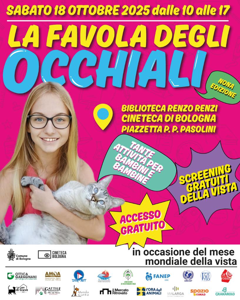 Evento in collaborazione con Comune di Bologna, Ottica Garagnani Srl, AMOA - Oculisti per l'Africa, Dry-Art, A.M.R.E.R Ass. Malati, Ca'Rossa Teatro, Fanep Odv, Andare a Veglia OdV, UNICEF, Vitruvio Bologna, La casa di Giove, Mondo Gatto ODV Bologna, Mercato Ritrovato, L'Ora degli Animali, Centro Commerciale Vialarga, Granarolo.
